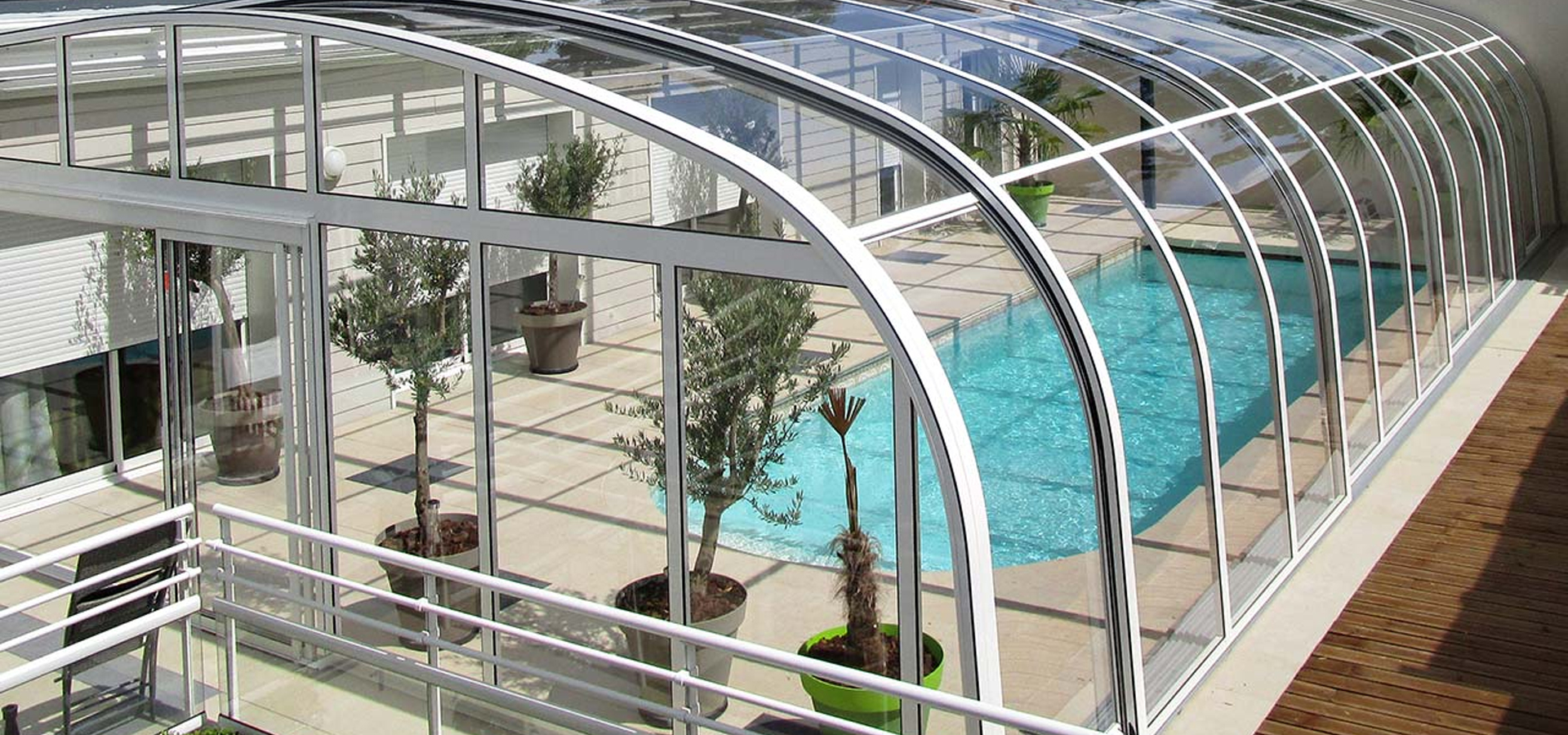 Die Schwimmhalle DOMIZIL lässt sich an Wände oder auf Mauern anbringen. Auf diese Weise lässt sich das Wohnhaus mit der Poollandschaft verbinden und sogar die Terrasse integrieren. Absolute Wetterunabhängigkeit ist das Ergebnis. Ein direkter Zugang aus dem Wohnhaus und auch weitere Zugänge aus dem Garten werden genau nach Ihren Vorgaben und Wünschen konstruiert und umgesetzt. Diese Poolhalle überzeugt durch eine gleichmäßig gebogene und weitläufige Profillinie sowie maximaler Stabilität.