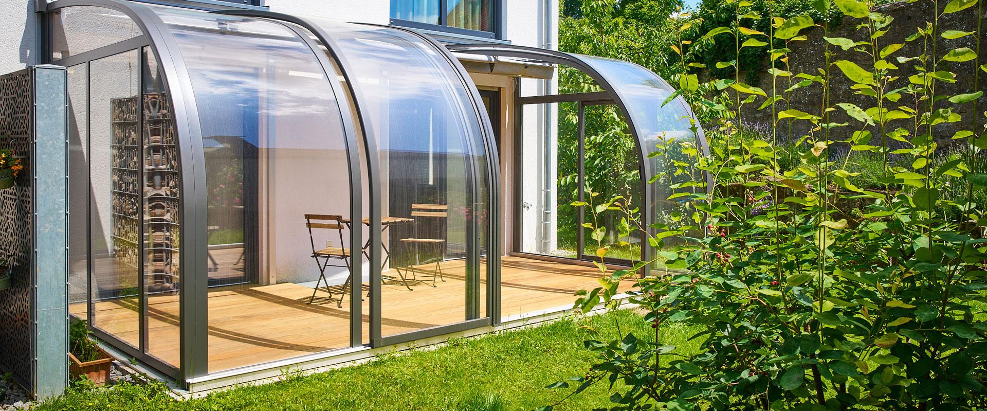 Im Winter bleibt die Terrasse nutzbar. Die transparente, gebogene Dachfläche fängt die Sonnenwärme ein und schafft ein angenehmes Raumklima. Die gespeicherte Wärme kann zusätzlich angrenzende Wohnräume unterstützen.