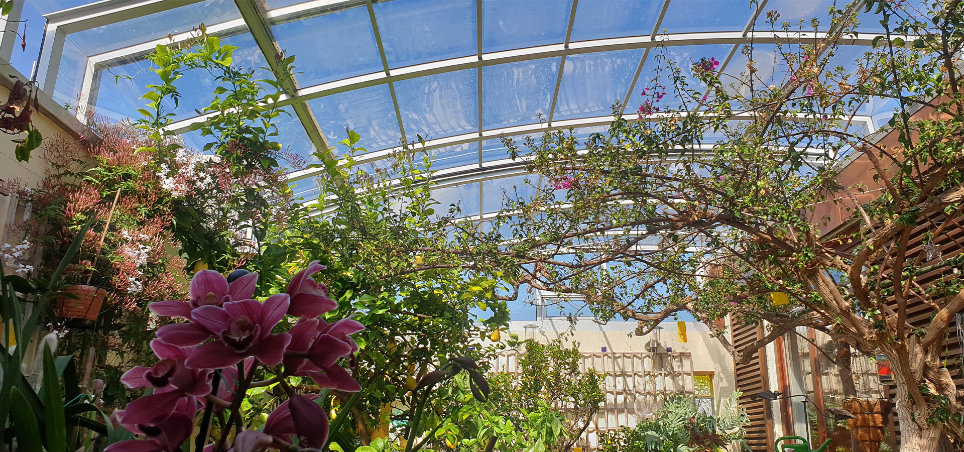 Die robuste Aluminiumkonstruktion mit transparenter Verglasung sorgt für Stabilität und maximale Lichtdurchlässigkeit. Selbst im Winter speichert die durchdachte Bauweise die Sonnenwärme und schafft eine angenehme Temperatur – ganz ohne zusätzliche Heizung.